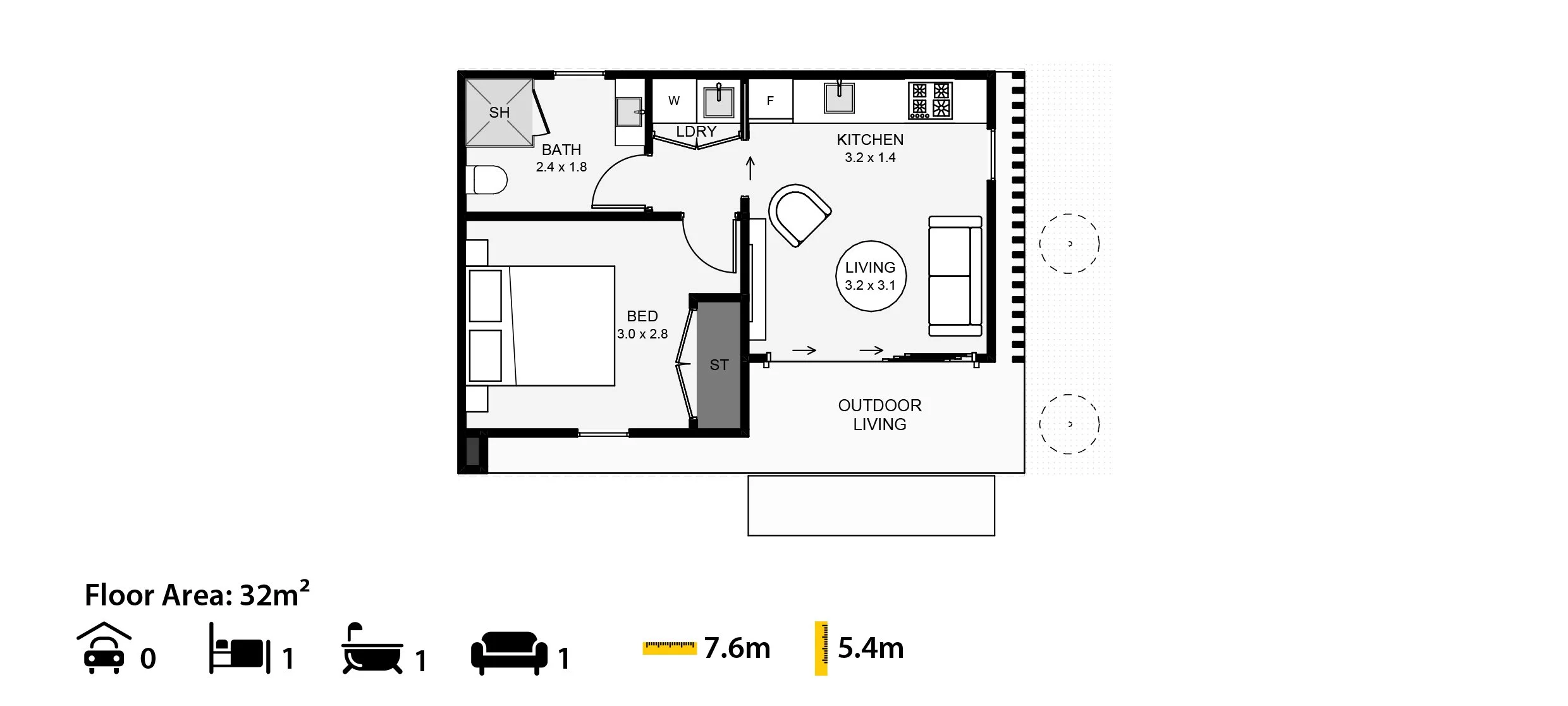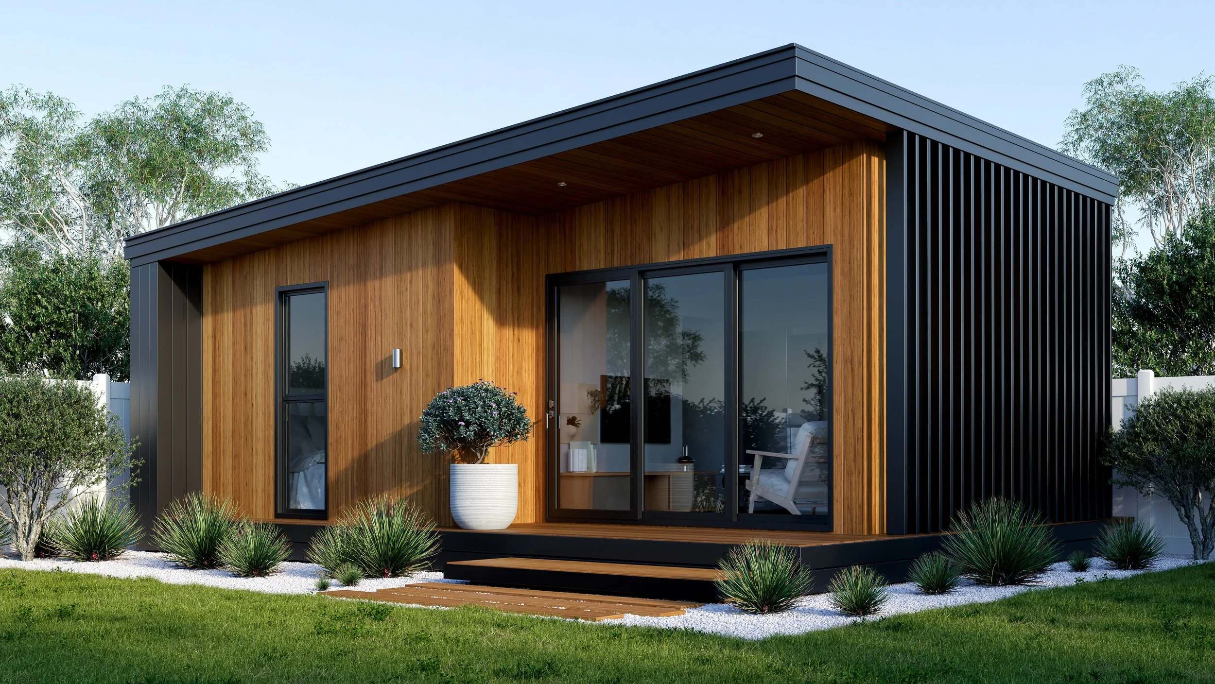 Discover contemporary elegance with our modern mono pitch roof granny flat, featuring cedar cladding and vertical grooved panels with a refined paint finish. Inside, you'll find a well-designed space with one bedroom, a stylish bathroom, a convenient laundry nook, and a functional kitchen and living area. This granny flat offers a perfect blend of style and practicality for modern living.