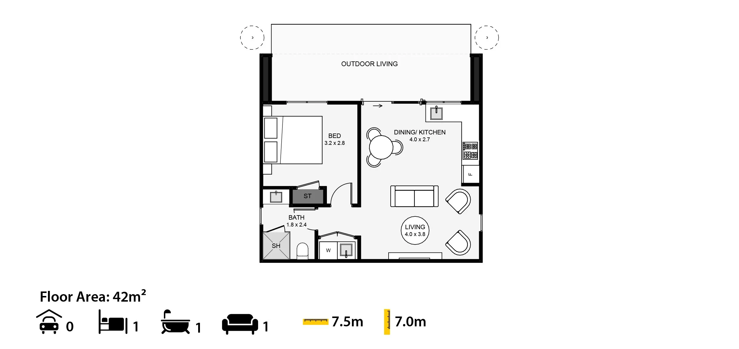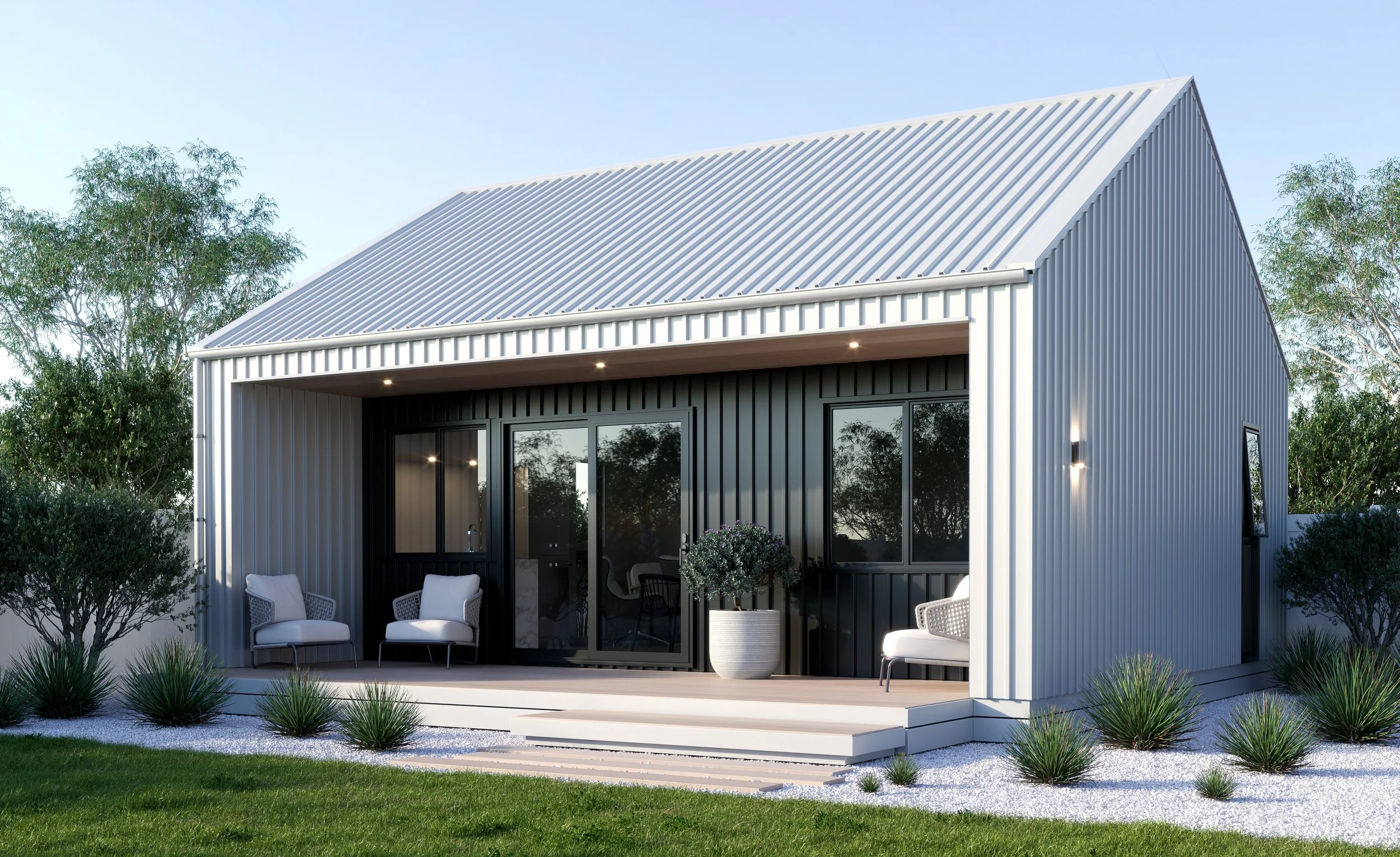Enjoy timeless elegance with our gable roof granny flat, featuring a metal roof and wall cladding with contrasting extrusions for a stylish covered outdoor living space. Inside, you'll find one bedroom, a bathroom, and an open-plan living, kitchen, and dining area. This granny flat combines classic design with modern functionality, making it a perfect addition to any property.