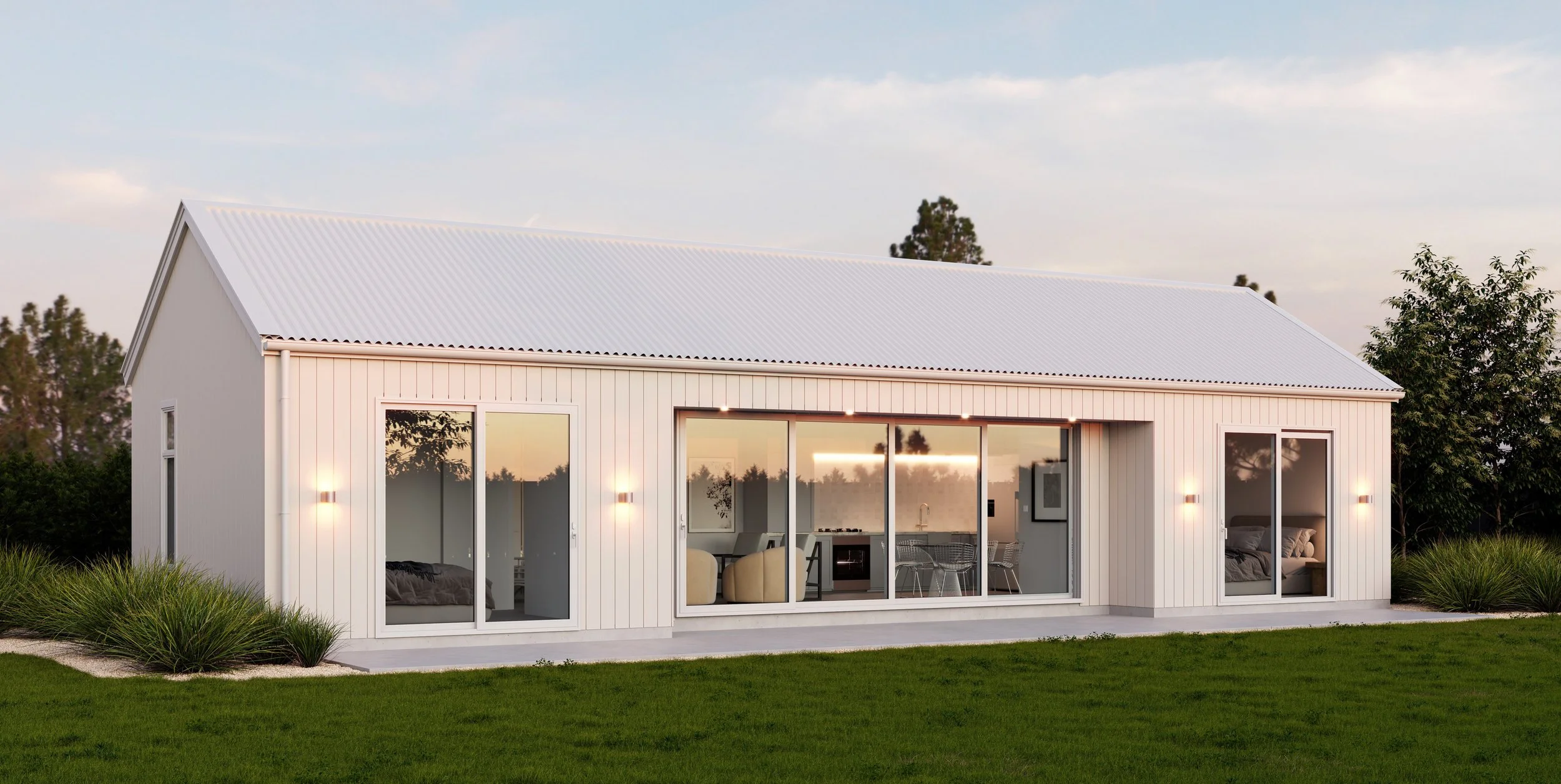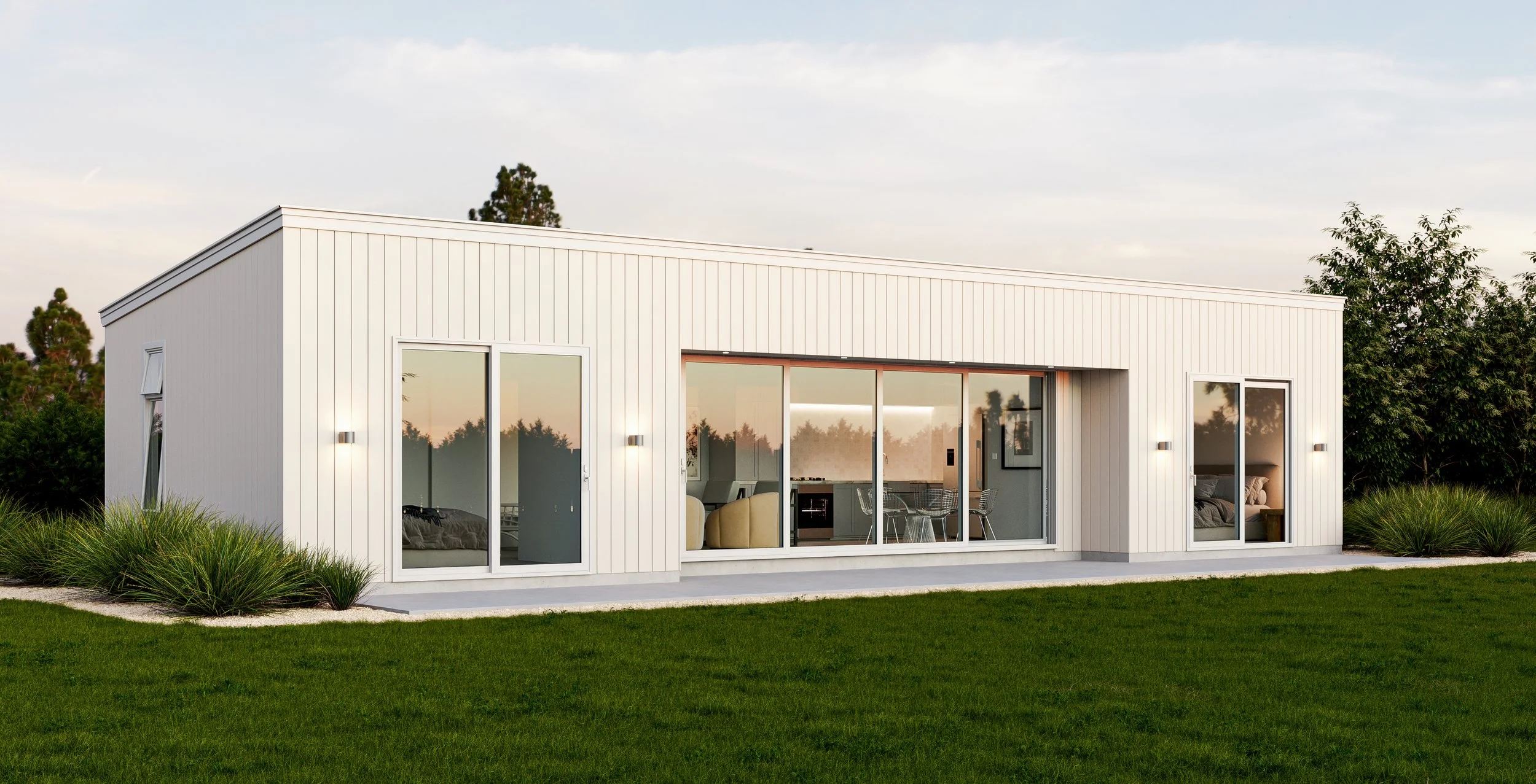 Need three bedrooms but still want to keep it simple? This design nails it. A light-filled living zone runs along the centrewith full-glass sliders opening out to the deck. Bedrooms are spaced for flexibility—ideal for a young family, guests, oreven a work-from-home setup. Smart, no-fuss living. Also available in a monopitch roof version.